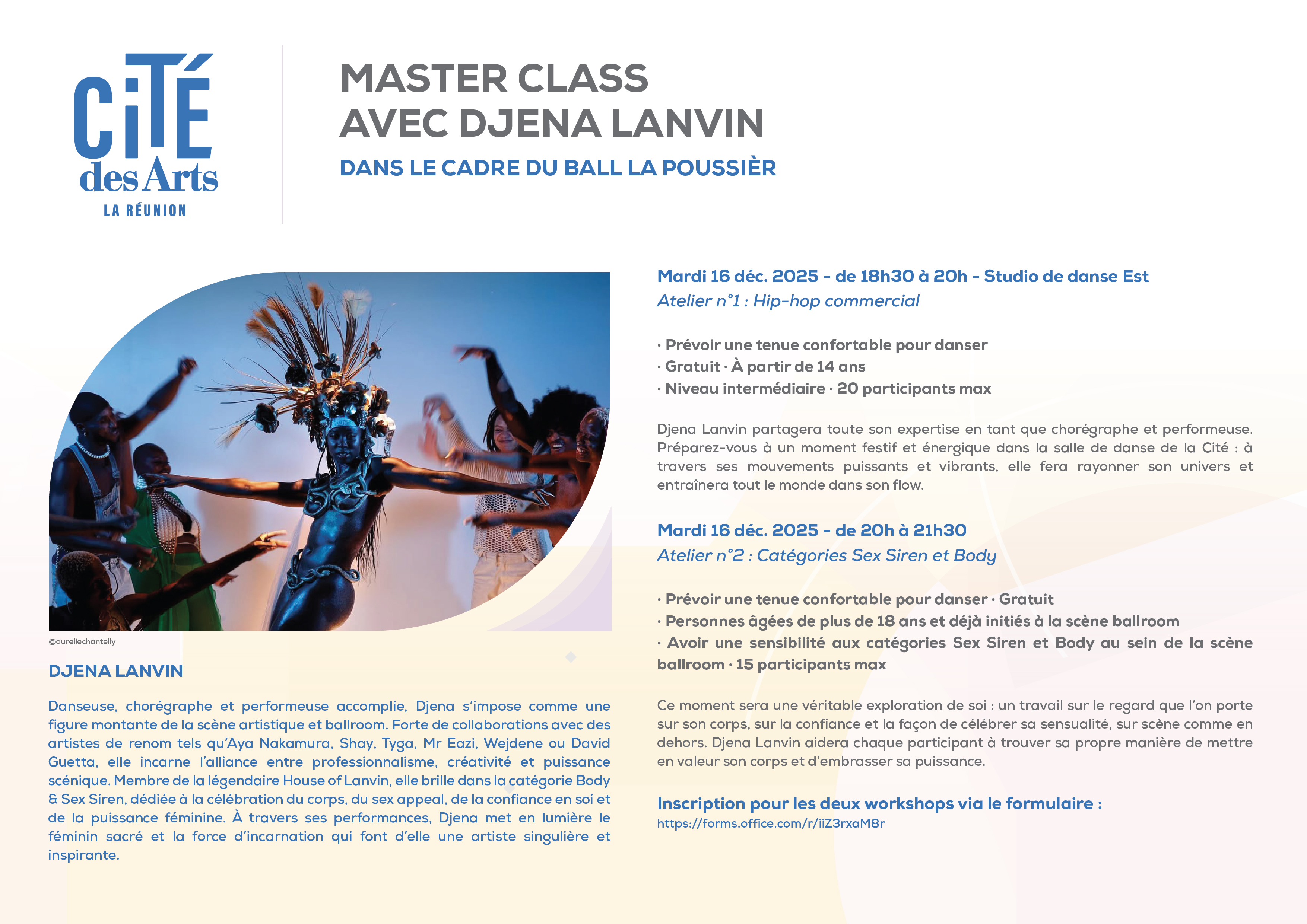 Djena Lanvin donnera deux ateliers le mardi 16 décembre 2025 à la Cité des Arts, dans le cadre du Ball La Poussièr.